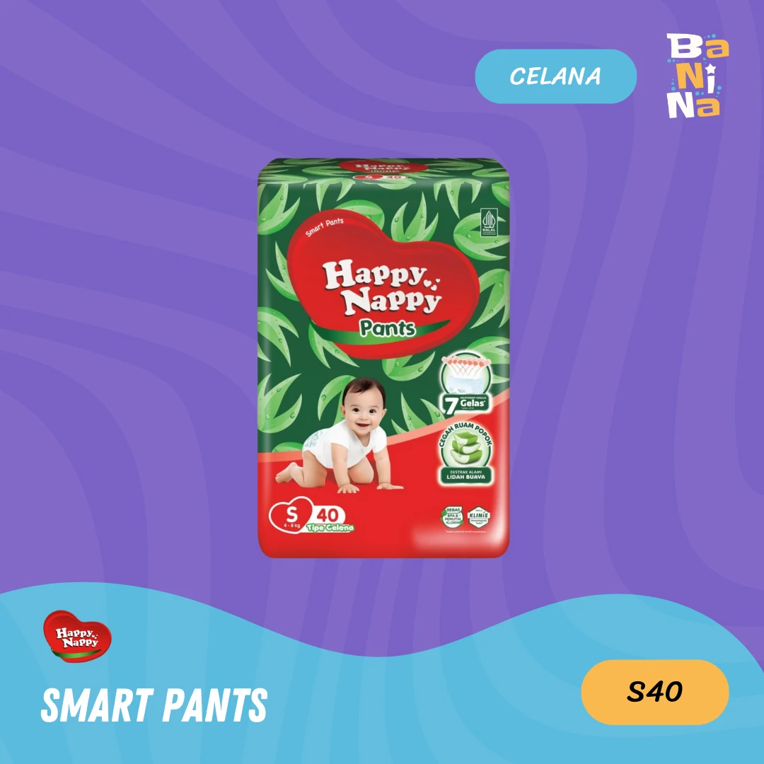 Happy Nappy Smart Pants S40 adalah popok yang hadir dengan karet pinggang elastis yang tidak meninggalkan bekas sehingga membuat si kecil tetap nyaman beraktivitas. Teknologinya mampu menciptakan sirkulasi udara yang menyeluruh untuk menghindari kegerahan dan membantu bayi lebih lega bernapas. Kandungan aloe vera alaminya mampu mengurangi potensi iritasi dan menjaga kelembapan kulit bayi sehingga dapat mencegah ruam popok. Dan meski bahannya selembut kain, Happy Nappy Smart Pants mampu menyerap secara baik hingga setara 7 gelas 40 ml